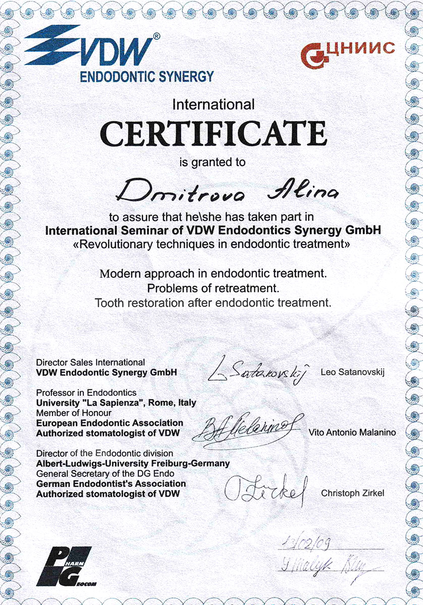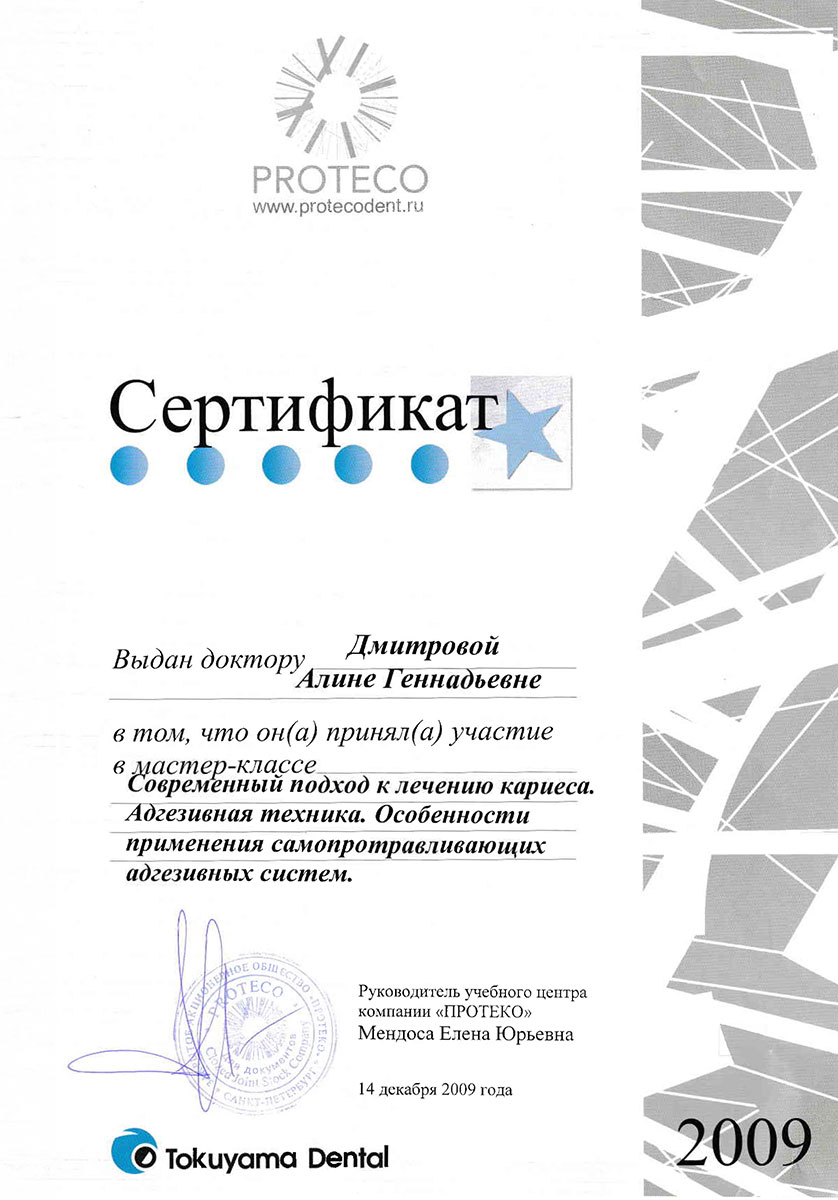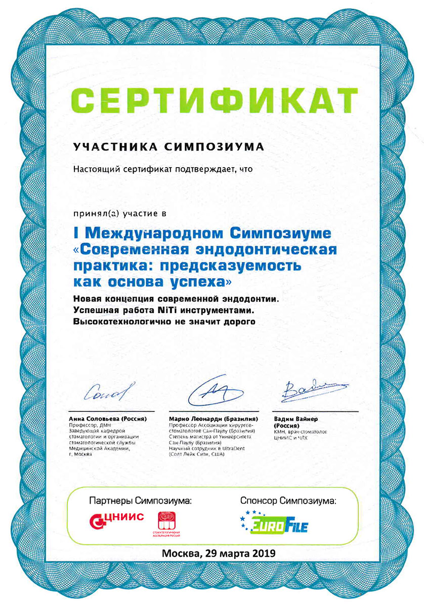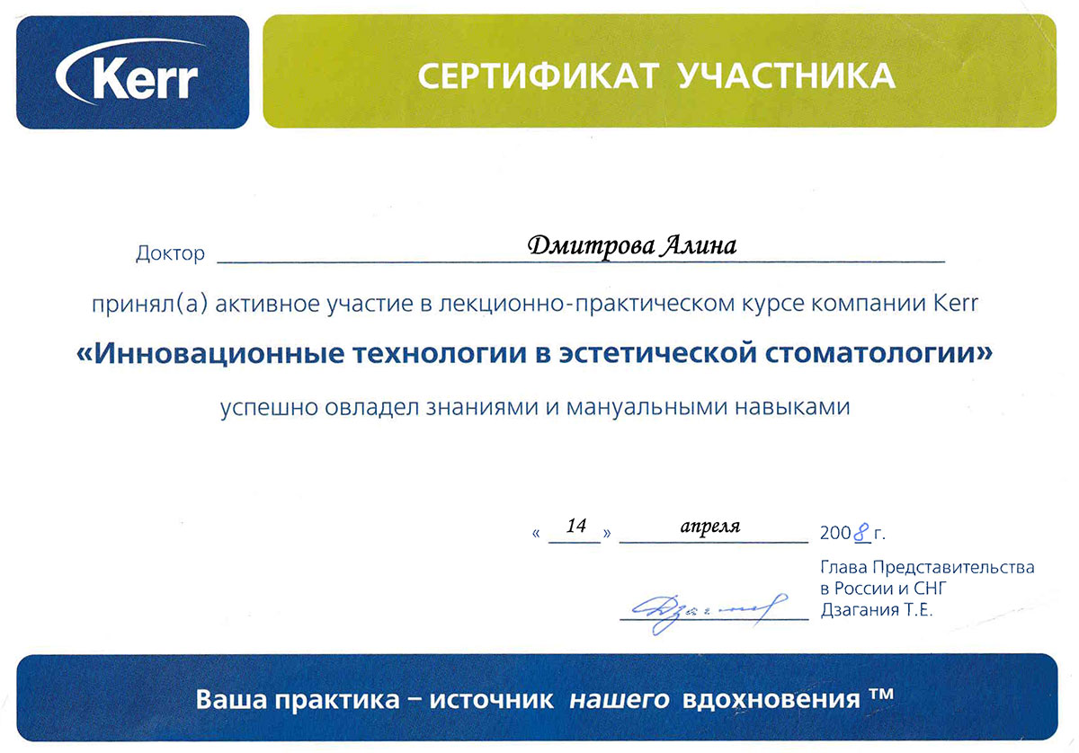 - 2008 г. - «Инновационные технологии в эстетической стоматологии», Kerr, г. Москва.