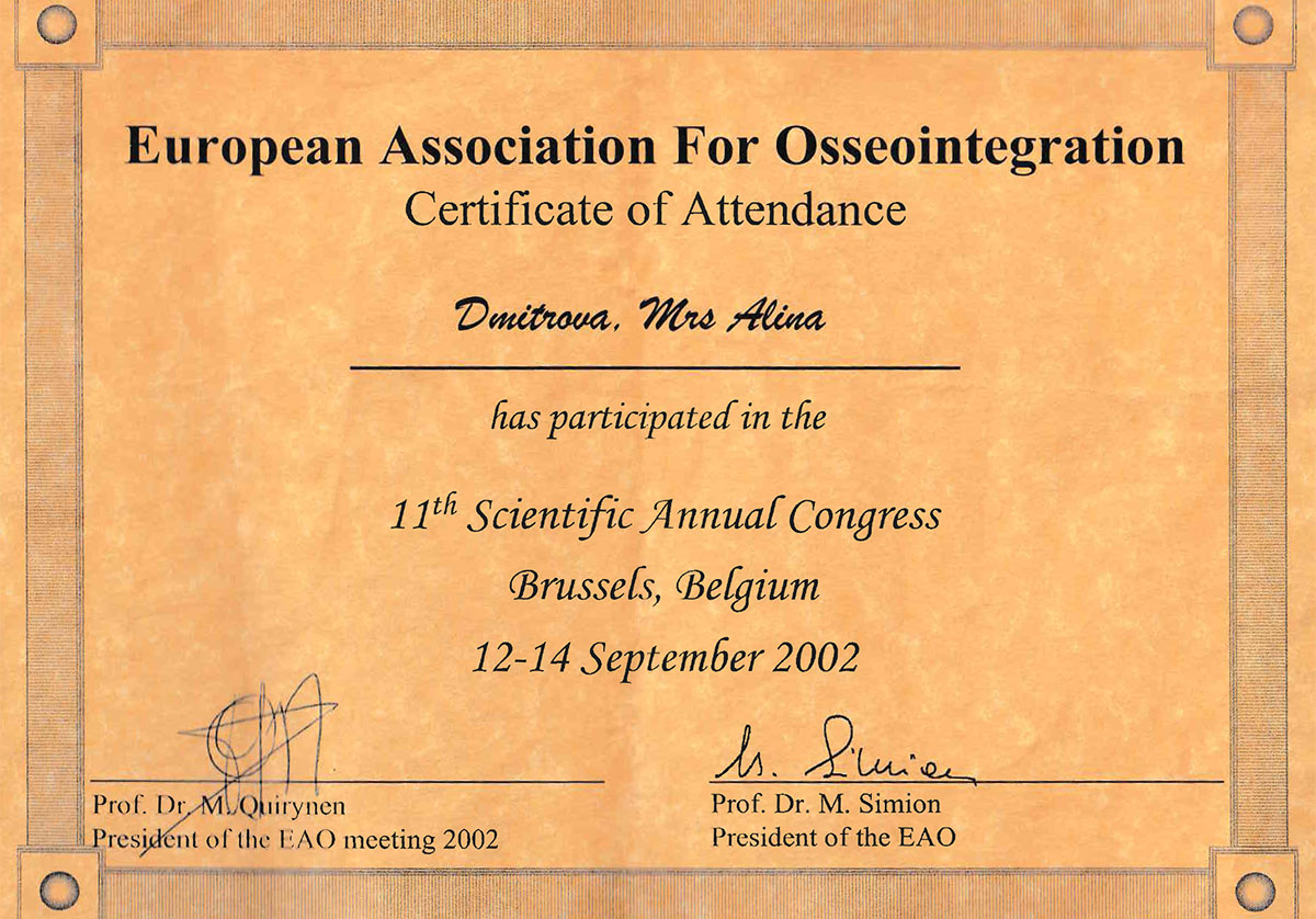 - 2002 г. - European Congress of Association for Osseointegration, г. Брюссель.